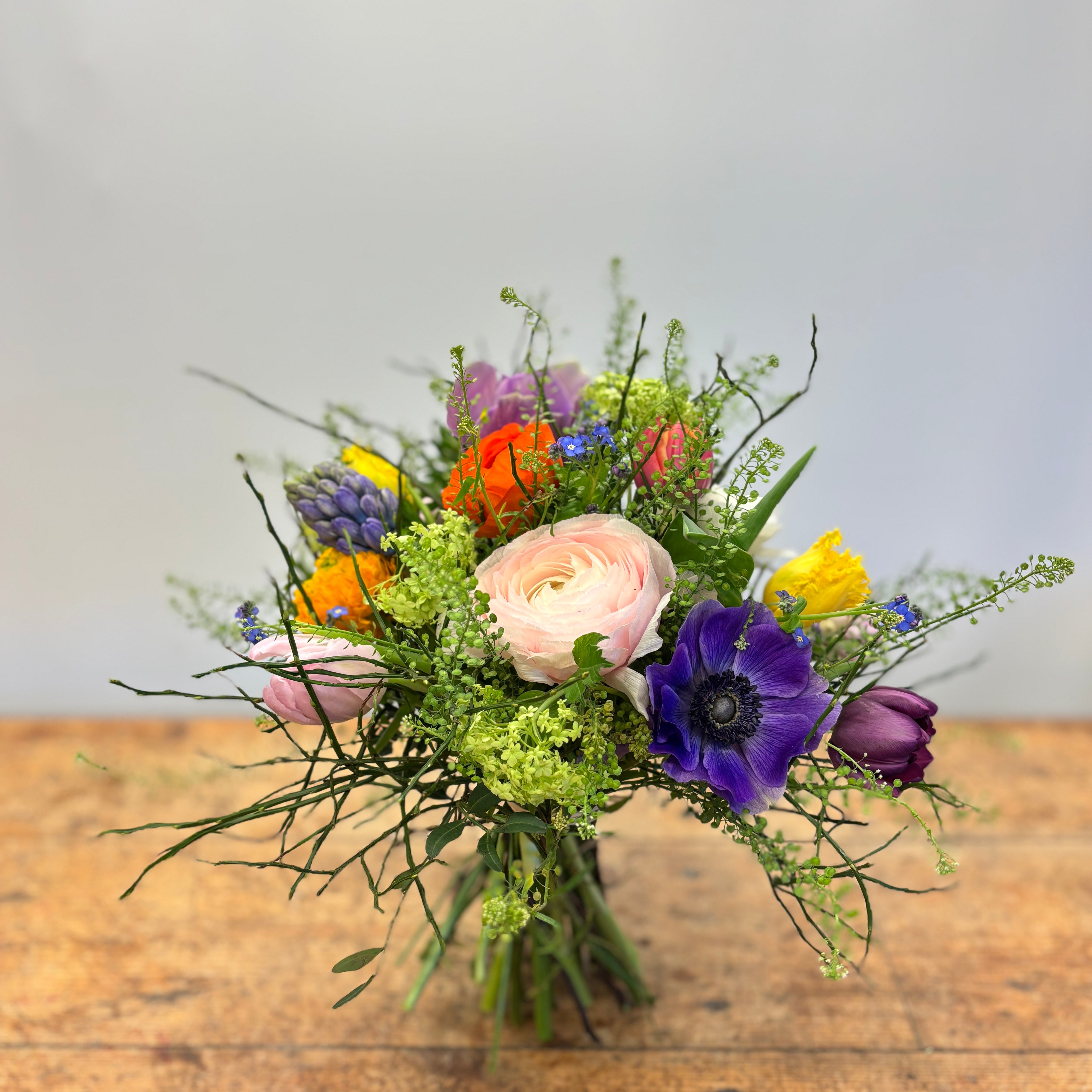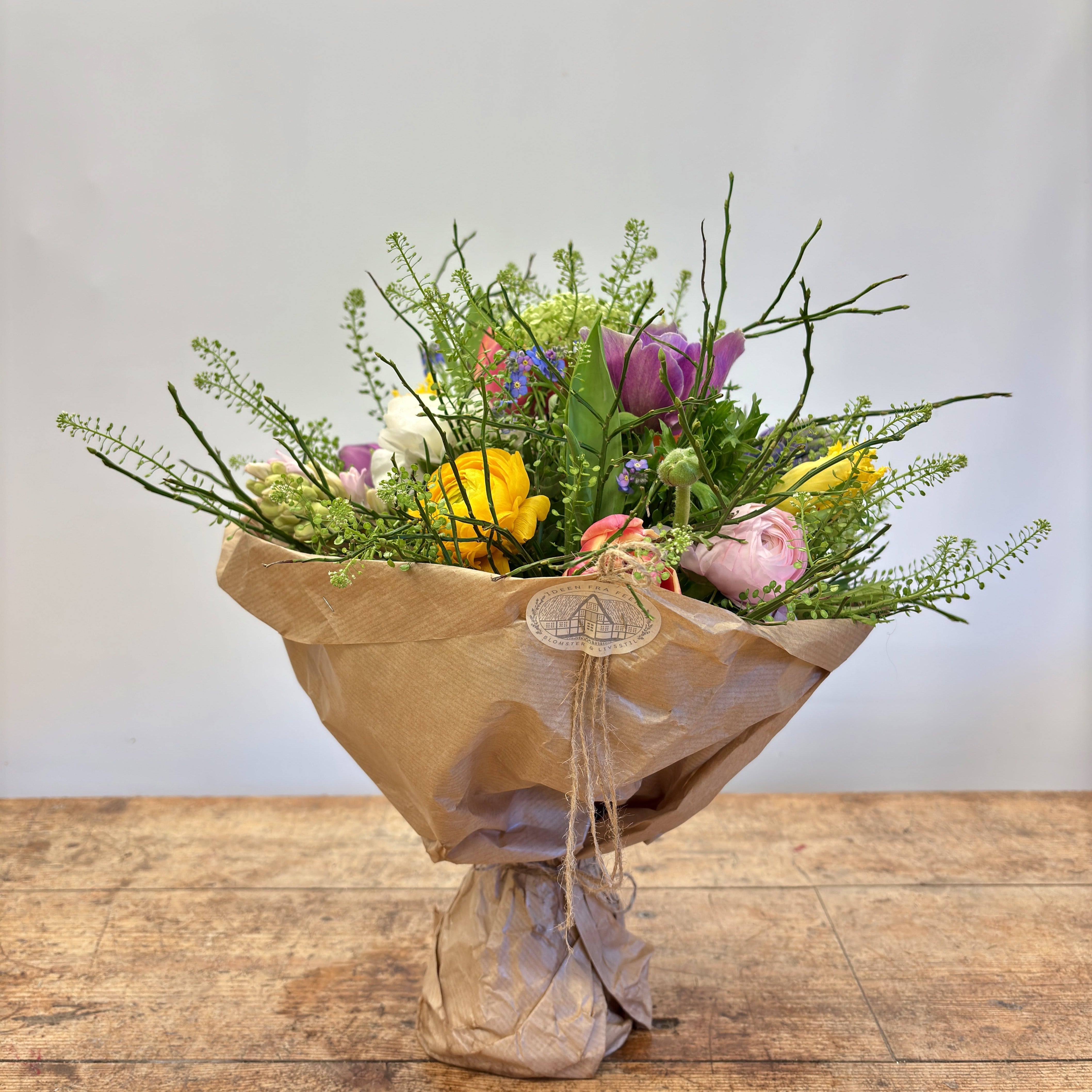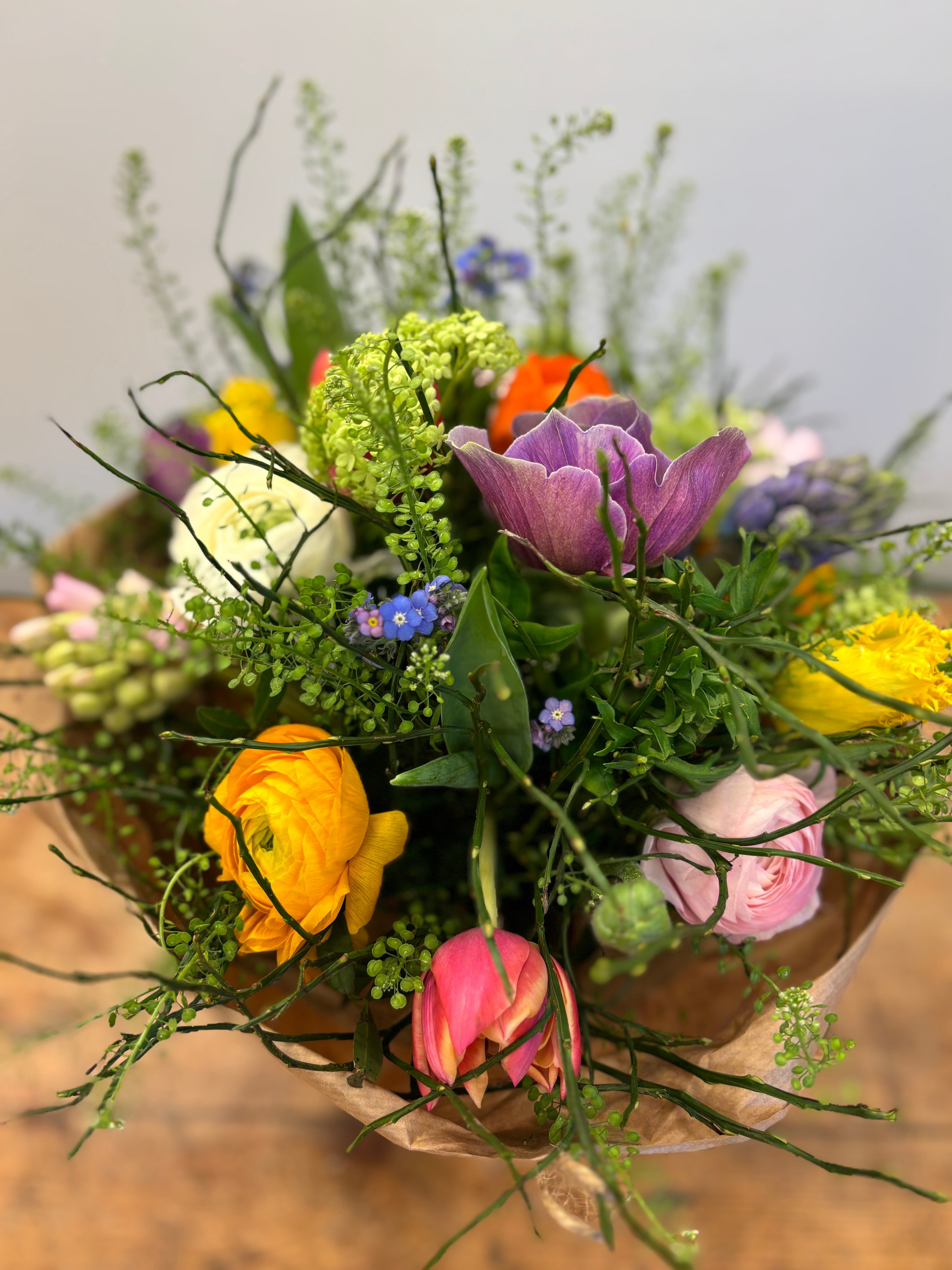 Vores forårsbuket er bundet med et smukt mix af forårets blomster, der varierer alt efter dagens udvalg. Du kan blandt andet finde forglemmigej, tulipaner, franske anemoner, ranunkler, juleroser, viburnum, syrener, fresia, hyacinter, blåbærris og blomsterkarse.